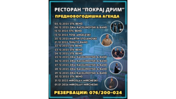 Од ресторанот „Покрај Дрим“ Струга најавуваат одлични предновогодишни и новогодишни забави и вкусна храна. -Од 20-ти декември до 3-ти јануари – жива музика секоја вечер, со познати бендови и одлична атмосфера. На 26-ти, 27-ми, 28-ми