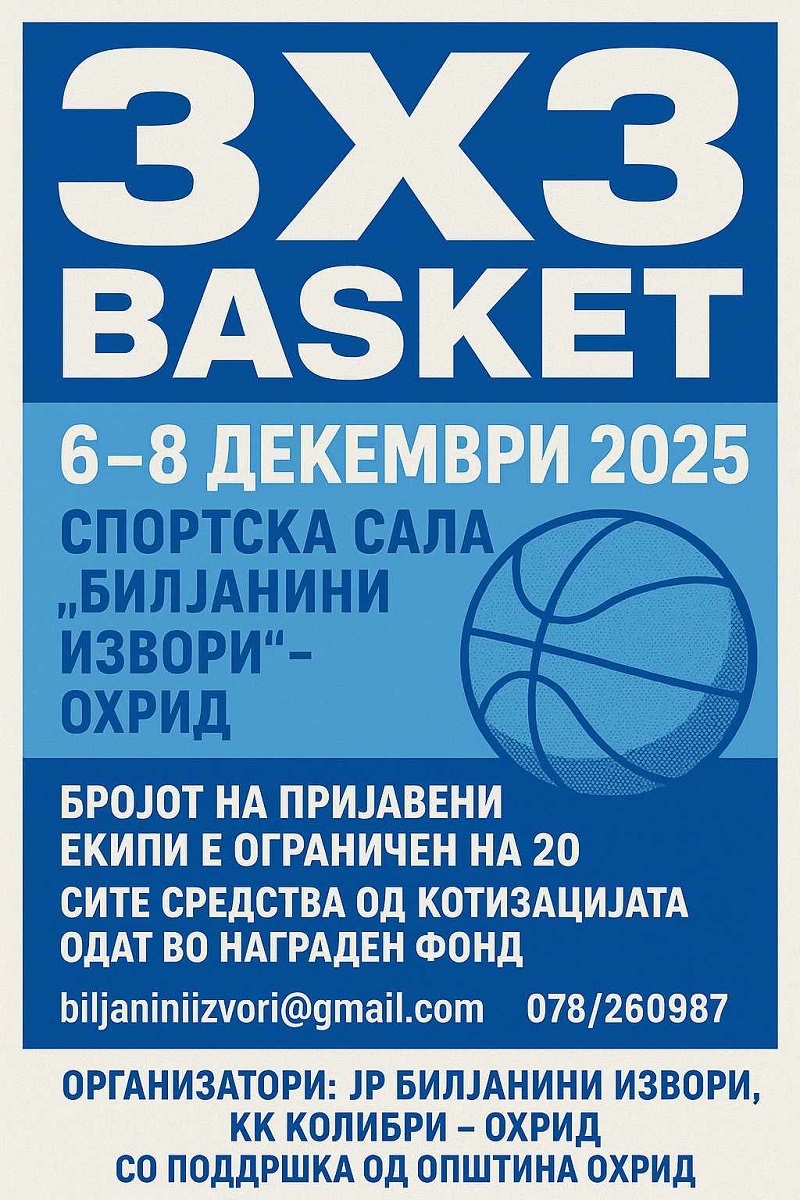 Градот Охрид повторно ќе биде домаќин на спортски спектакл, турнир во баскет 3×3 Охрид 2025, кој ќе се одржи од 6 до 8 декември во спортската сала „Билјанини Извори“. Настанот е организиран од ЈП