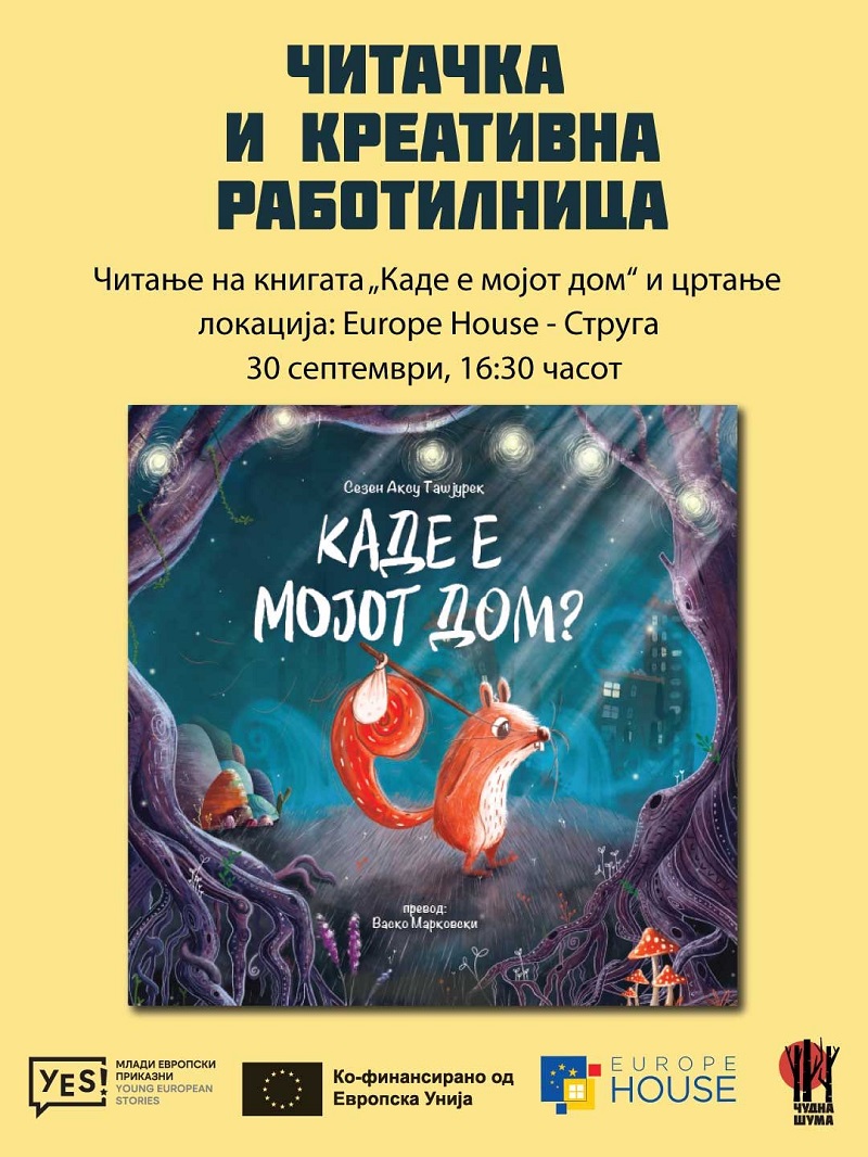 На 30 септември (понеделник) со почеток во 16:30 часот, во Europe House Струга ќе се одржи креативна и читачка работилница инспирирана од сликовницата „Каде е мојот дом?“. Работилницата ќе ја води писателката, уредничка и едукатор Билјана Црвенковска, а е наменета за деца на возраст од 6 и 7 години.