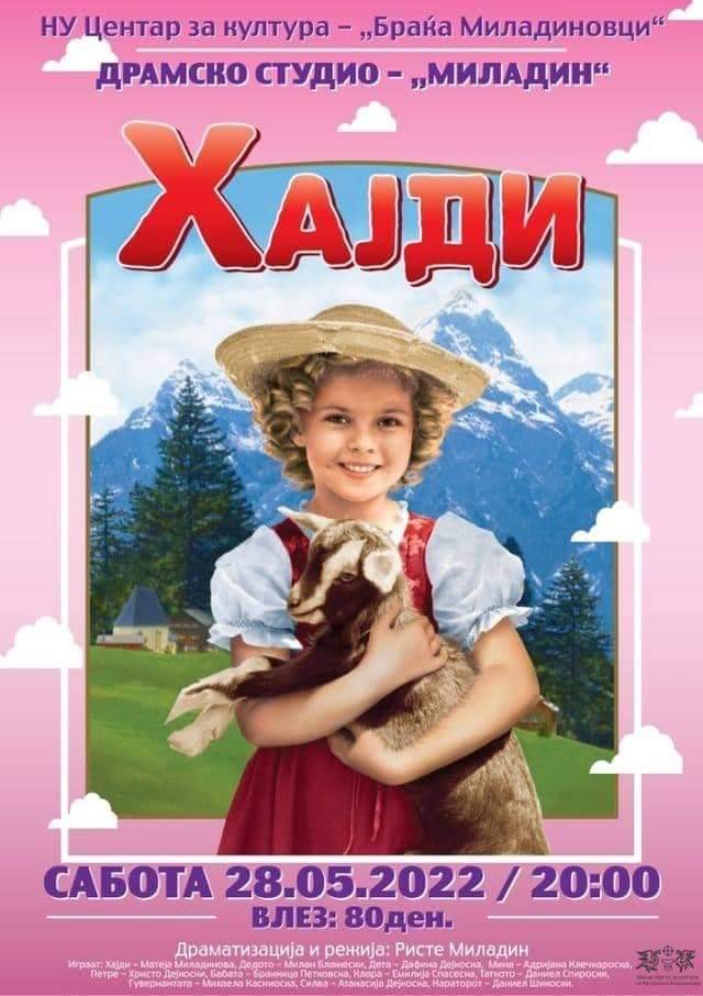 Оваа сабота (28.05) во Центарот за култура,,Браќа Миладиновци” – Струга во 20:00 часот ќе биде одиграна драмската претстава ,,Хајди“, во драматизација и режија на Ристе Миладин. Улогите ги играат членовите на драмското студио ,,Миладин“-