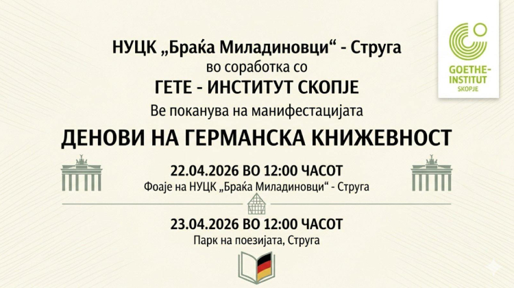 По повод Светски ден на книгата и авторското право, НУЦК „Браќа Миладиновци“ Струга во соработка со Гете-институт Скопје организира манифестација „Денови на германска книжевност“, која ќе се одржи во Струга во текот на два дена.