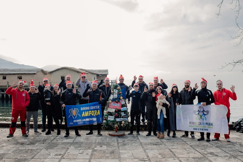 Елката ја поставија нуркачите на нуркачкиот центар „Амфора“ во соработка со Здружението за ретки болести со поддршка на волонтерите на Црвениот Крст од Охрид.
