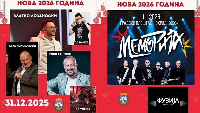 На 31-ви декември на Градскиот плоштад „Свети Климент Охридски“ во пресрет на дочекот на Новата 2026 година, охриѓани и туристите ќе може да уживаат во настапот на Македонската поп ѕвезда Влатко Лозановски, охридската фолк икона Ефто Пупиноски, охридскиот музички ас Ѓоко Танески, DJ Yuxell и DJ Bagzi. Музичкиот дел започнува во 20:00 часот.