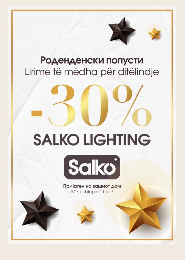 ,,Салко“ роденденски попуст! Цел асортиман од осветлување со попуст од 30%. Асортиман од домачинство со попуст од 15%. На сите намалени артикли плус екстра попуст од 15%.