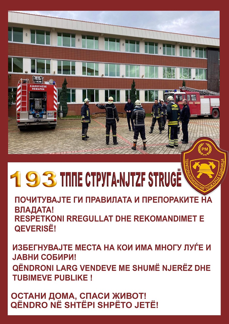 Со одлука на градоначалникот на општина Струга, се известуваат граѓаните на Општина Струга, дека во текот на денешниот ден Територијалната противпожарна единица Струга заедно со ЈП Комунално Струга ќе се врши миење на најфрекфентните улици во општина Струга, пристапот до јавните здравствени установи и други места, а во раните утрински часови ќе се врши целосна дезинфекција на истите. Поради тоа, се замолуваат граѓаните да ги тргнат своите возила од улиците и да ги паркираат на соодветно место за полесно и поефикасно извршување на својата работа.