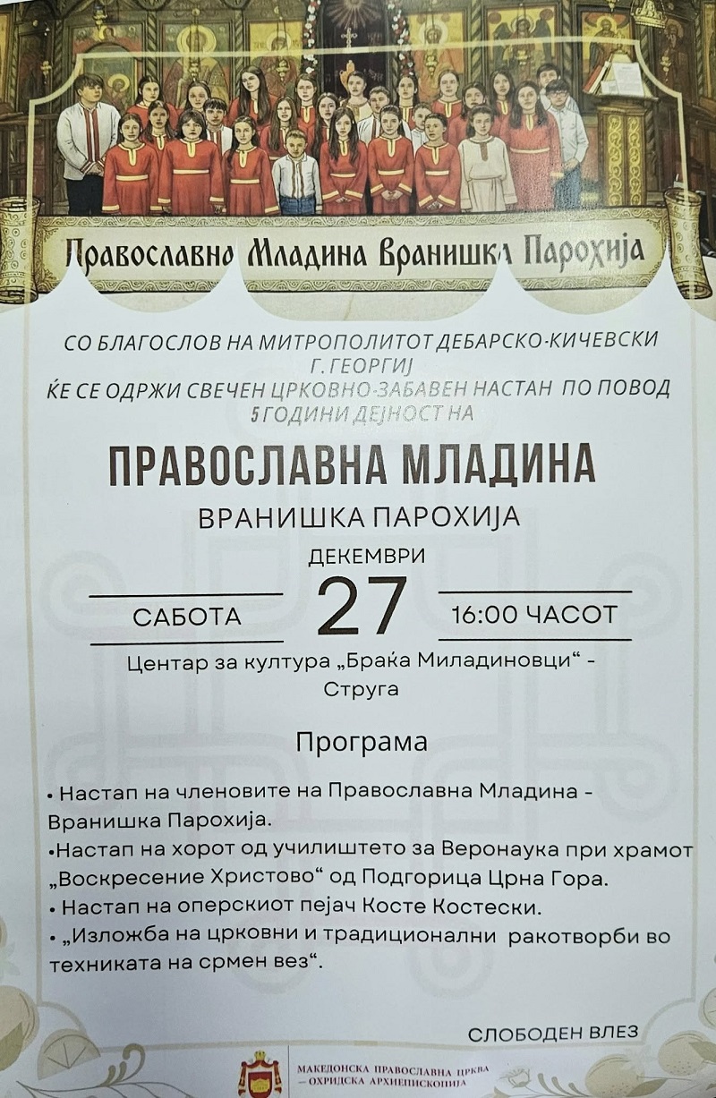 Во сабота на 27 декември во Струга ќе се одржи свечен црковно-забавен настан по повод одбележување 5 години Православна младина Вранишка парохија во кој ќе има Духовно-културна програма со хорови, солист и изложба на традиционални ракотворби.