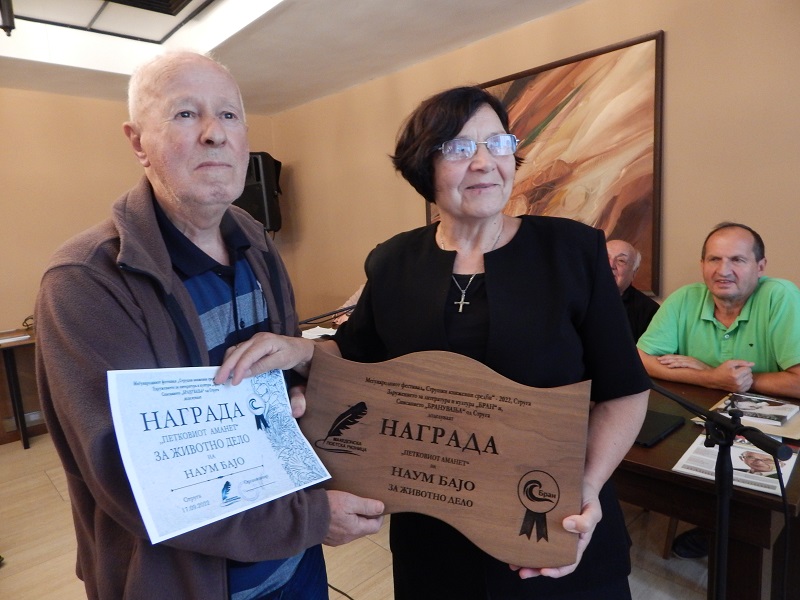 Сопругата на покојниот Петко Шипинкаровски, Крста (Кети) Шипинкаровска, на истакнатиот струшки новинар во „Нова Македонија“ Наум Бајо, му ја врачи наградата за „Животно дело“за 2022.