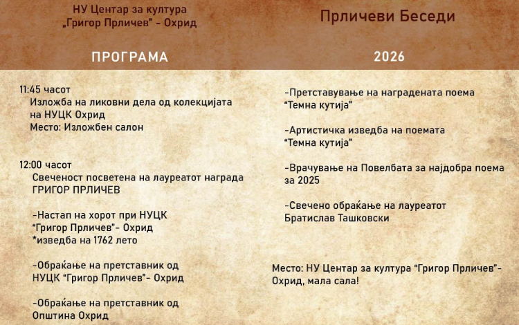 Манифестацијата „Прличеви беседи“ и годинава го афирмира македонското литературно творештво и го негува споменот на големиот поет Григор Прличев.