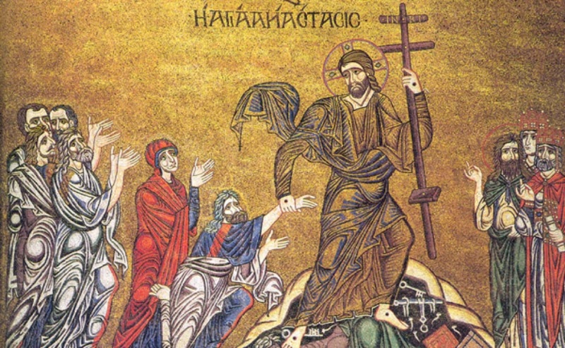 Откако слугите на првосвештениците израилски го фатија Исус и Го предадоа на Пилат со барање да биде распнат, а Пилат за да им угоди конечно така и пресуди иако не Му најде вина, Господ пострада со смрт на Крст. Висеше меѓу двајца разбојници, од кои едниот Го похули а другиот Го прослави, спасувајќи се со ова себеси за живот вечен. Во оној страшен миг неговите ученици се разбегаа како што Самиот им предрече; освен апостолот Јован Заведеев и мајка Му под Крстот, малку подалеку стоеја и неколку жени коишто последните години Му служеа со своите имоти. Покрај Него тогаш немаше други, освен непријателите и минувачите во неверие. Евангелието подробно пишува за смртта. Потоа Јосиф од Ариматеја, кој Му беше ученик, се осмели и го побара од Пилат телото за да го погребе. Го положија во еден нов гроб којшто Јосиф го имаше скроено во карпа. Го затворија влезот со камен и заминаа. За воскресението дознаа во мугрите во неделата, кога оние верни жени појдоа со миризливи масла на гробот за да Го помазаат телото, кое не Го најдоа. Веста ја прими прва Марија Магдалина и побрза да им јави на апостолите и тие не поверуваа. Петар и Јован самите се стрчнаа до гробот и го најдоа каменот одвален, а од телото лежеа оставени само повоите. По ова, кога се собраа заедно во куќата, Исус им се јави и разбраа дека воскреснал. Но им го отвори умот и за да ги разбираат Писмата. Им се јави и на Лука и Клеопа додека одеа во Емаус, но не Го препознаа веднаш. Срцата им гореа на сите.